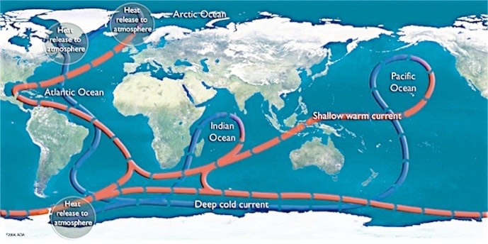 Figure 8q-2: The following illustration describes the flow pattern of the major subsurface ocean currents. Near surface warm currents are drawn in red. Blue depicts the deep cold currents. Note how this system is continuously moving water from the surface to deep within the oceans and back to the top of the ocean. (Source: Arctic Climate Impact Assessment A third-generation resident of Long Beach, California, Charles Moore is the captain of Alguita, an independent oceanographic research vessel. In 1994 he founded the Algalita Marine Research Foundation (www.algalita.org), dedicated to research, education, and restoration of the marine environment. Since launching his ship in 1995, Moore, who received his captain’s license from the U.S. Coast Guard, has conducted ocean and coastal sampling for plastic fragments and debris across a wide swath of the northern Pacific Ocean.-ACIA).