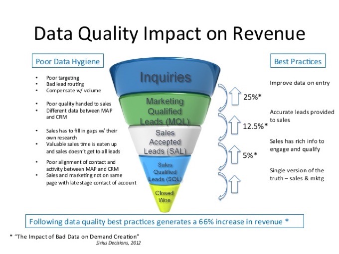 • Data quality efforts are often needed while integrating disparate applications that occur during merger and acquisition activities, but also when siloed (!sic) data systems within a single organisation are brought together for the first time in a data warehouse or big data lake. Data quality is also critical to the efficiency of horizontal business applications such as enterprise resource planning (ERP) or customer relationship management (CRM).